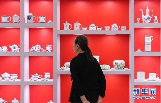 5月10日,在上海举行的2019年中国品牌日活动上,一名观众在一个瓷器展架前驻足观看。新华社记者 方喆 摄