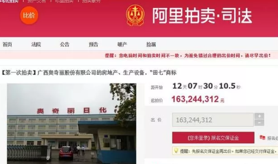根据拍卖信息,标的处置单位为广西壮族自治区梧州市中级人民法院。拍卖公告称,该法院定于2019年6月11日上午10:00至2019年6月12日上午10:00止(延时的除外)在淘宝网网络司法拍卖平台上对被执行人广西奥奇丽股份有限公司所有的位于梧州市园区一路1号土地使用权、梧州市旺甫外向型工业园区A7、A8土地使用权及地上的房屋、建筑物,生产设备(牙膏、湿巾),“田七”57个商标整体进行网络公开拍卖。