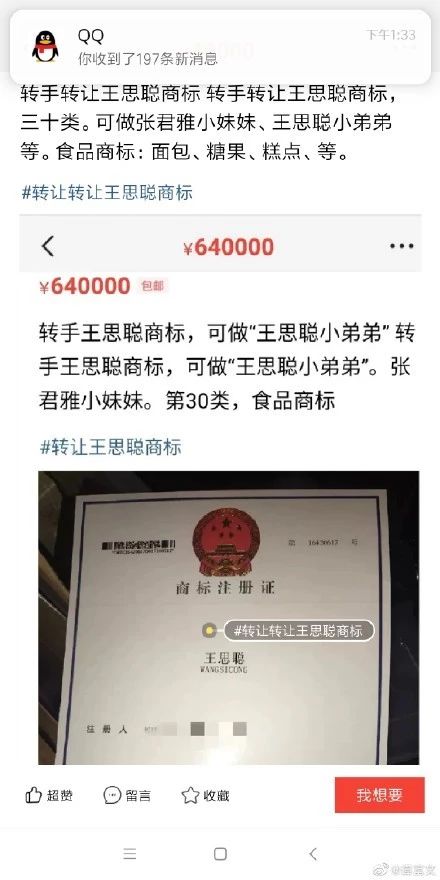 这件商标很早之前就在闲鱼上挂着,此前标价更贵,要80万