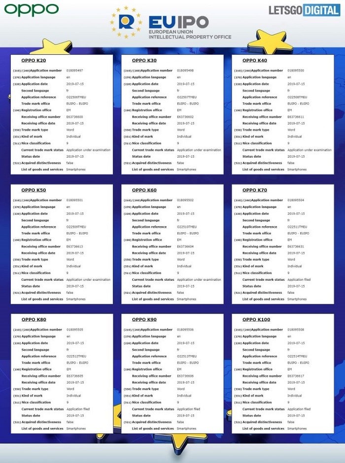 近期,oppo向欧洲知识产权局提交了至少22件商标注册申请,全部是和OPPO K系列有关。