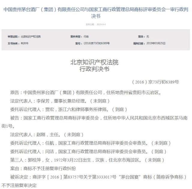 2016年,茅台集团将商评委告到北京知识产权法院。近日,法院宣判,驳回茅台集团对商评委的起诉。