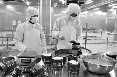 浙江衢州鲟龙水产食品科技开发有限公司是集鲟鱼产品技术研发、加工、贸易于一体的水产食品加工龙头企业,具备鱼苗繁育、养殖基地、鱼子酱及鲟鱼产品加工和销售的一整条生产链,目前具备30吨鲟鱼子酱和1000吨冻鲟鱼的年生产能力,是全国出口鱼子酱最大的加工基地。在衢州检验检疫局的帮扶下,公司通过了ISO9001质量管理体系、HACCP和ISO22000食品安全管理体系认证。图为鱼子酱罐装现场。(iso9001认证)