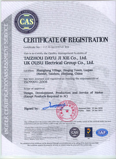 大宇机械iso9001英文证书台州市大宇机械是英国欧速集团在中国刹车片生产基地,使用英国工艺配方和技术,生产高品质的欧速汽车盘式刹车片(BRAEK PADS),品种覆盖市场各主流车型。热情欢迎国内外工商人士莅临考察指导。携手大宇,共铸辉煌。