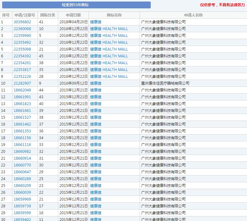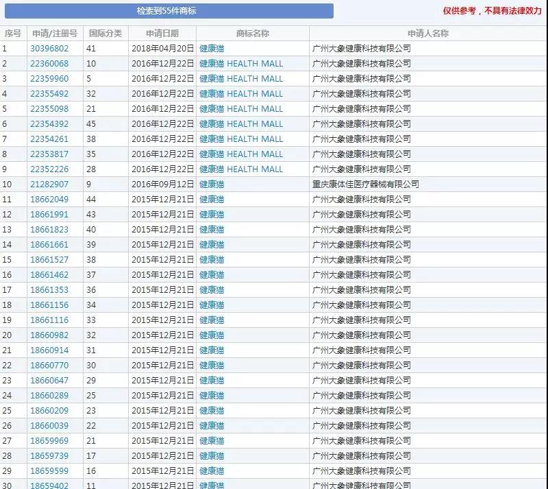 最最最让人惊讶的是广州大象健康科技有限公司在全部45类上注册了“健康猫”商标!且全部注册成功!这对于一个破产企业来说,无疑也是可以起死回生的一笔财富。(关于“健康猫”网上曝出该公司高管的种种违法问题,笔者在此不做评论,仅讨论商标品牌保护意识等问题。)