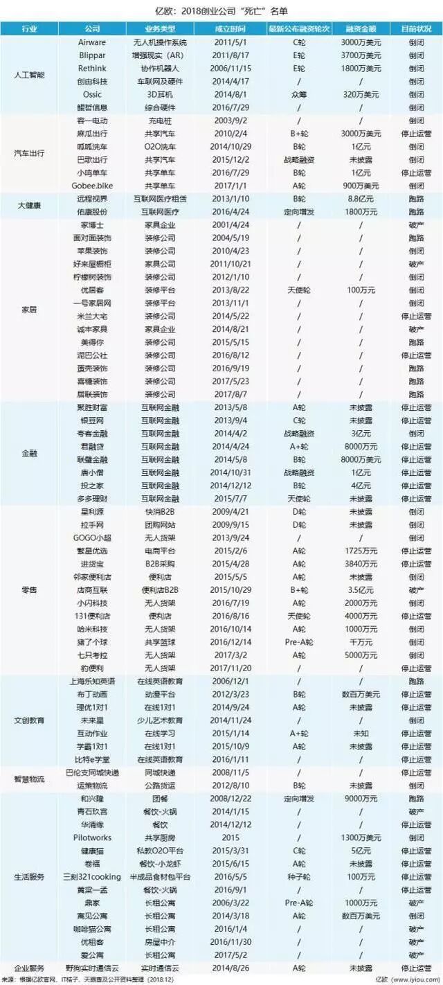 以上就是近日亿欧网发布的2018创业公司“阵亡”名单,该名单由亿欧网根据其官网、IT桔子、天眼查及公开资料整理制作,在经历停业、破产、跑路……2018年,在一声叹息中,它们还是英勇的倒下了。“寒冬”一时成为当下的热词,寒冬之下,怎见暖阳?如何生存与突破成为创业公司关注的焦点。