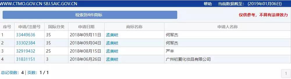 其中,与“孟美岐”有关的商标共有4件,与“吴宣仪”有关的商标共有3件,注册类别为第3类、第25类、第35类。