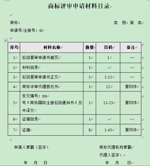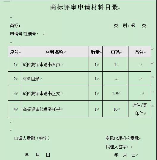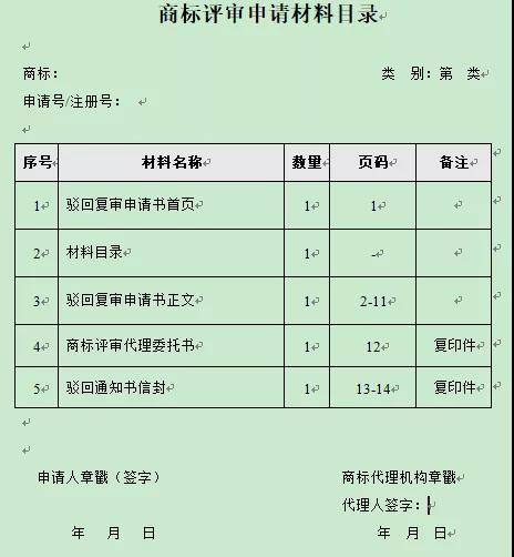 领取纸质《驳回通知书》的驳回复审申请,仅需申请书首页,材料目录,理由书和委托书4份文件,其中,仅委托书需要客户签署(国内申请人需原件,外国申请人需打印件),驳回复审期限为15日。上述两种情形材料目录示例如下: