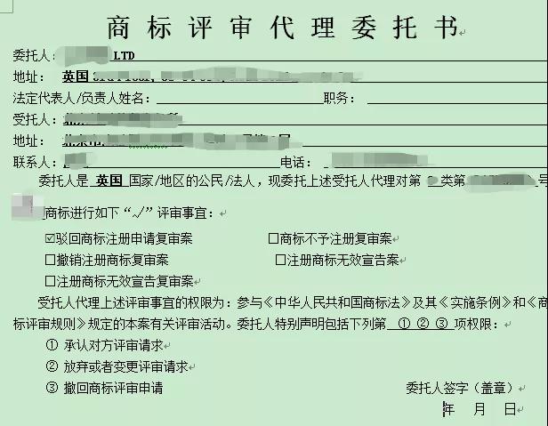 马德里商标国际注册指定中国的领土延伸保护申请的驳回复审可以直接以申请人外文名称和地址进行,地址仅需在原有外文地址的前面加上中文国籍即可,无需进行中文翻译。委托书申请人中文处填写外文即可。不需要提供主体资格证明及翻译。委托书及材料目录示例如下: