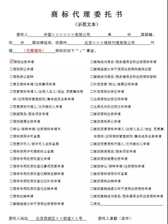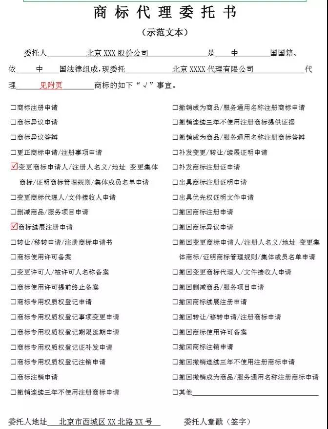 此举将便利需同时进行变更和转让,或同时需进行变更和续展,或同时需部分注销和转让等的申请人和代理人。需要注意的是,委托书附页也需申请人签字/盖章。具体通知见上,委托书模板见下:
