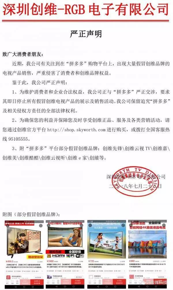 7月28日,国产家电巨头创维向拼多多发出了维权声明,称拼多多平台上出现了涉嫌假冒创维品牌的电视产品,要求拼多多立即停止所有假冒创维电视产品的展示及销售活动,同时也保留追究拼多多及相关侵权方的全部法律责任。