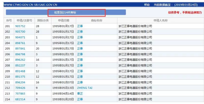 根据中国商标网数据,截止目前,浙江正泰共申请注册214件商标,包括“正泰”“泰正”“ZHENG TAI”“CHNT”“SIMBATT”等商标,大部分已注册成功。