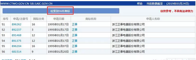 经过检索,与“正泰”有关的商标共有56件。浙江正泰于1993年01月20日,申请注册了第681514号第9类“正泰”商标,并于1994年03月14日获准注册。