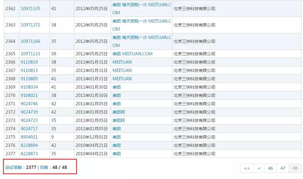 团购巨头美团,企业名称北京三快科技有限公司(下称三快公司),一向重视知识产权保护,在美团成立的同一年就开始申请注册相关商标,到目前为止,共申请注册了2377件商标,包括“美团”、“美团网”、“MEITUAN”、“美团 MEITUAN.COM”等,中文、拼音、域名统统都有。