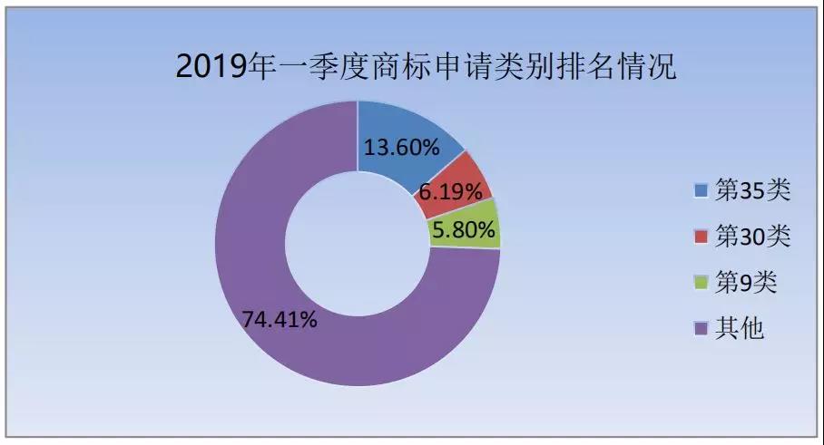 (二)商标注册申请量集中的类别与产业结构调整趋势吻合。服务类别商标注册申请量逐年提高,2019 年第一季度,服务类别商标注册申请量为 54.3 万件,占申请总量的 34.97%,同比增长 9.4%。在所有类别中,申请量排名前三的依次是第35 类(21.1 万件)、30 类(9.6 万件)和第 9 类(9 万件)。与 2018 年全年申请量排名前三的第 35 类、25 类和 30 类相比,一季度申请人在农产品以及电子产品上商标注册申请需求有所增加、在服装上商标注册需求相对减少。