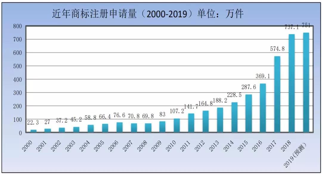 消息:4月29日,国家知识产权局商标局发布了"2019 年第一季度商标工作情况分析"。2019 年第一季度,我国商标注册申请量为 155.2 万件、同比增长 1.89%,与去年同期基本持平。新增注册商标 181.4万件,同比增长 54.07%。商标累计申请量 3676.5 万件,累计注册量 2412.2 万件,有效注册商标量 2119.5 万件,平均每 5.3 个市场主体拥有一个有效商标。