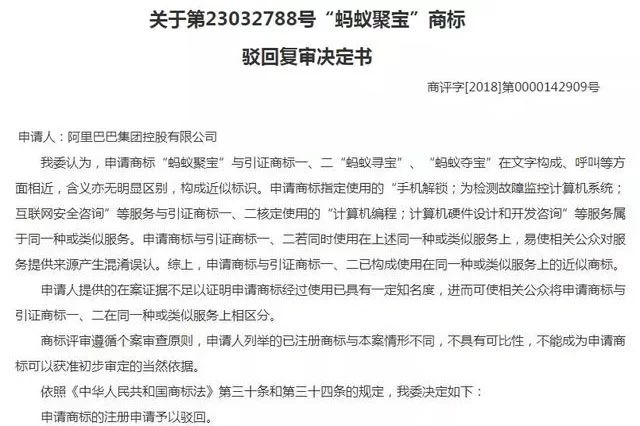 再举个例子,阿里巴巴申请“蚂蚁聚宝”商标,因与引证商标一、二“蚂蚁寻宝”、“蚂蚁夺宝”构成近似商标,易产生混淆被驳回。