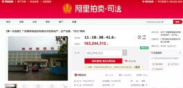 根据拍卖信息,标的处置单位为广西壮族自治区梧州市中级人民法院。拍卖公告称,该法院定于2019年6月11日上午10:00至2019年6月12日上午10:00止(延时的除外)在淘宝网网络司法拍卖平台上对被执行人广西奥奇丽股份有限公司所有的位于梧州市园区一路1号土地使用权、梧州市旺甫外向型工业园区A7、A8土地使用权及地上的房屋、建筑物,生产设备(牙膏、湿巾),“田七”57个商标整体进行网络公开拍卖。