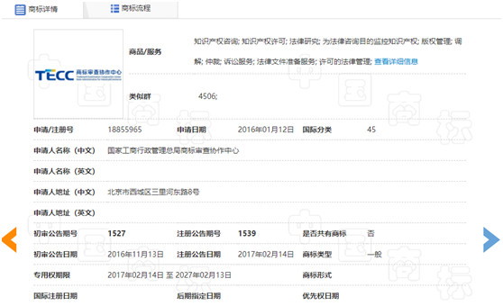 这点就不用多解释了吧,logo及多种组合样式,分别注册了35 、41 、42 、45四个类别,当你还处于为何注册这些类别有疑问的阶段时,来看看商标局怎么做的就明白了,具体类别的解释说过多次,在此不再一一赘述。