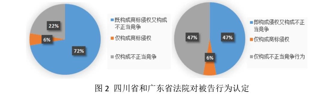 筛选的四川省案例在对被告行为的认定中,4件案件被认定仅构成不正当竞争行为,占比22%;1件案件被认定仅构成商标侵权,仅占6%;既构成商标侵权同时又构成不正当竞争的有13件,高达72%。