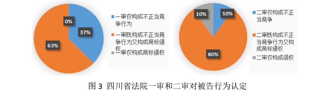 在四川省胜诉的18件案件中,一审有8件,二审有10件。其中一审有3件仅被认定构成不正当竞争行为,占比37%,5件被认定既构成不正当竞争又构成商标侵权,占比63%;二审中1件被认定构成了不正当竞争行为,1件被认定构成商标侵权,分别占比10%,8件被认定既构成不正当竞争又构成商标侵权,高达80%。