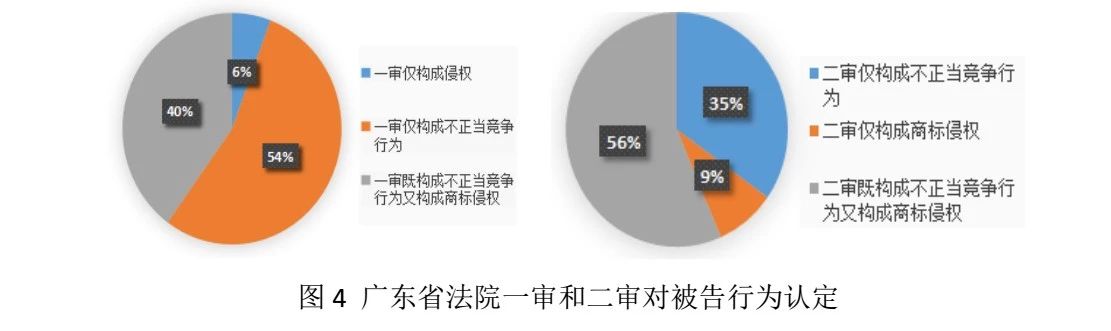 在广东省胜诉的58件案件中,一审有35件,二审有23件。其中一审有19件仅被认定构成不正当竞争行为,占比54%,2件被认定为仅构成商标侵权,仅占6%,14件被认定既构成不正当竞争又构成商标侵权,占比40%;二审中8件被认定构成了不正当竞争行为,占比35%,2件被认定构成商标侵权,仅占9%,13件被认定既构成不正当竞争又构成商标侵权,占比56%。