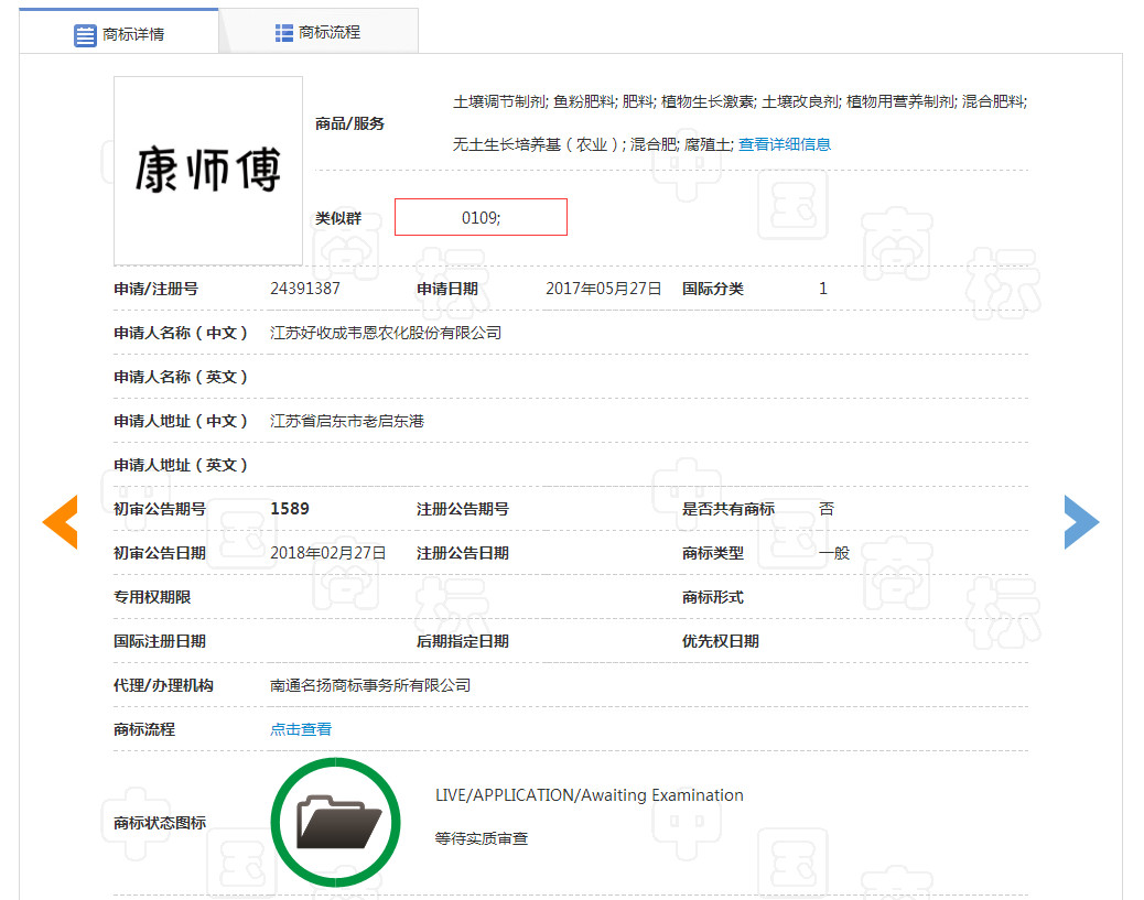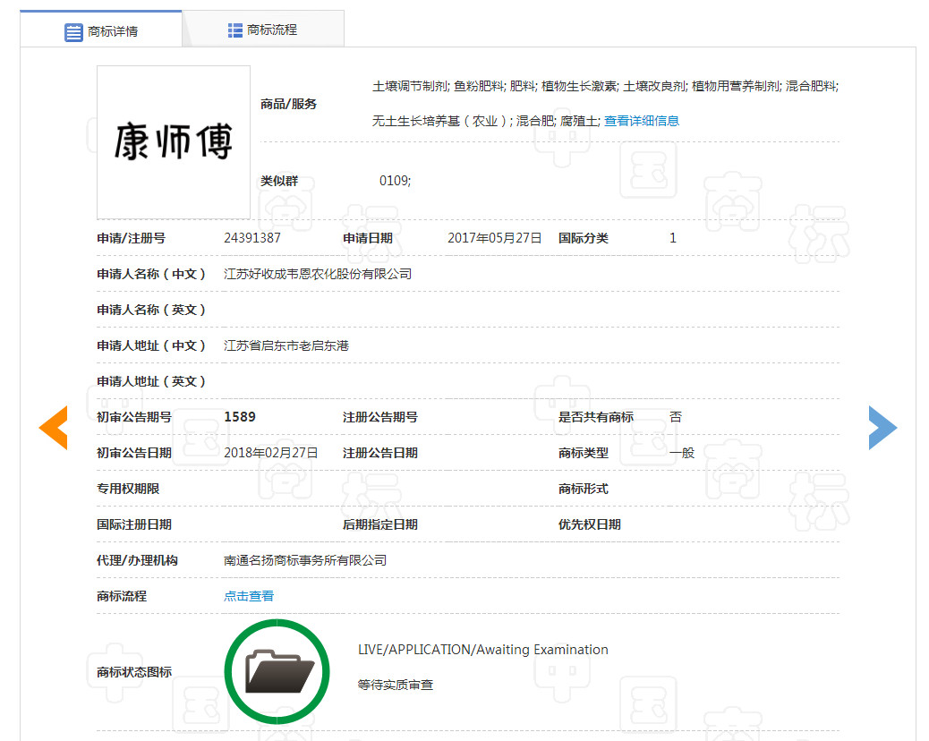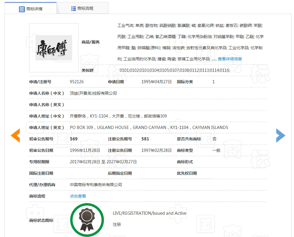 通过国家工商局查询后掌柜发现,有一家公司将“康师傅”这个商标注册了第一类别,也就是土壤、化肥、腐殖土等商品。
