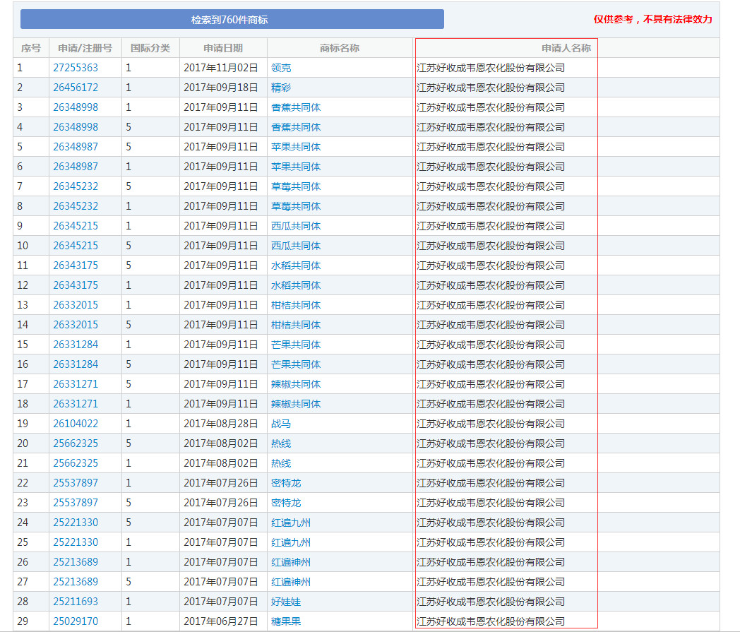 该企业已有30多年的历史,其专注于制造销售农药、化工及中间体产品,持有“好收成”和“GOOD HARVEST”等二十个商标。