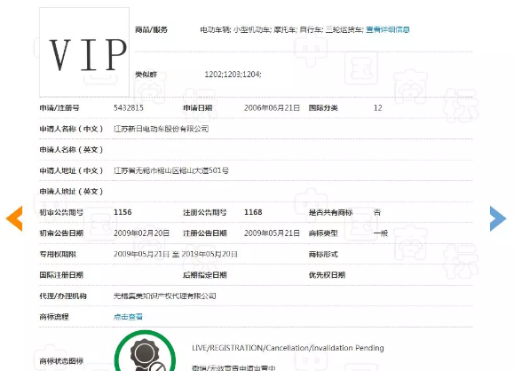 报道中还提到,2016年6月30日阿里贵宾(北京)有限公司(下称“阿里贵宾”)向国家商标局申请撤销新日股份第5432815号第12类“VIP”商标在“电动车辆”等全部核定使用商品上的注册。而新日股份2016年12月28日报送了招股书申报稿。2017年3月23日,国家商标局做出撤销决定。而在2017年4月发布的《招股说明书》“商标”一栏的“国内注册商标”中这样表述:“截至2016年9月30日,本公司在国内拥有商标权107项,商标注册人均为新日股份。”列表中序号为12,注册号位5432815的就是商标“VIP”。