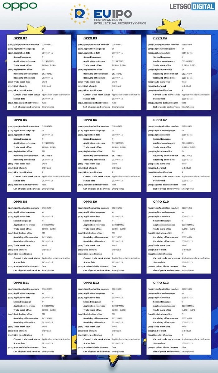 近期,oppo向欧洲知识产权局提交了至少22件商标注册申请,全部是和OPPO K系列有关。