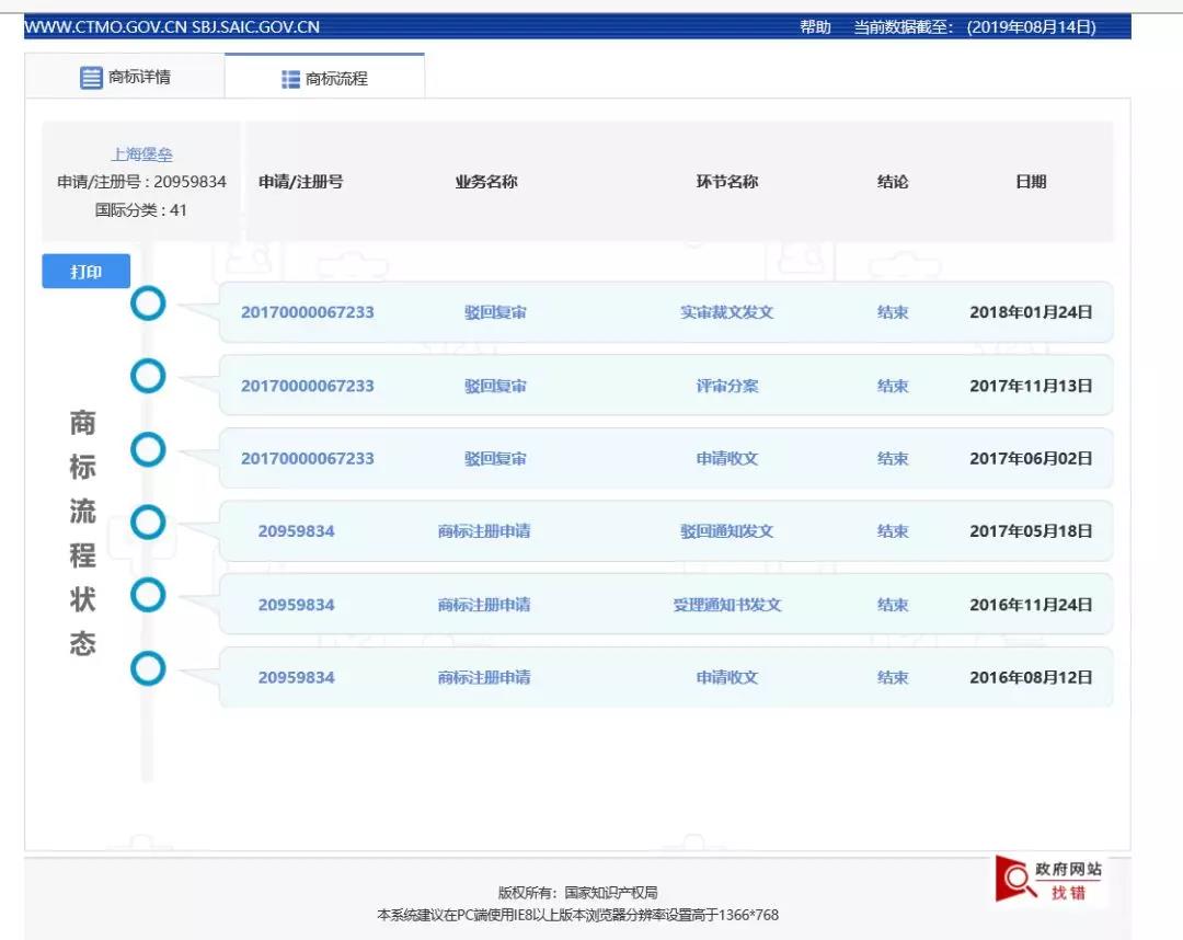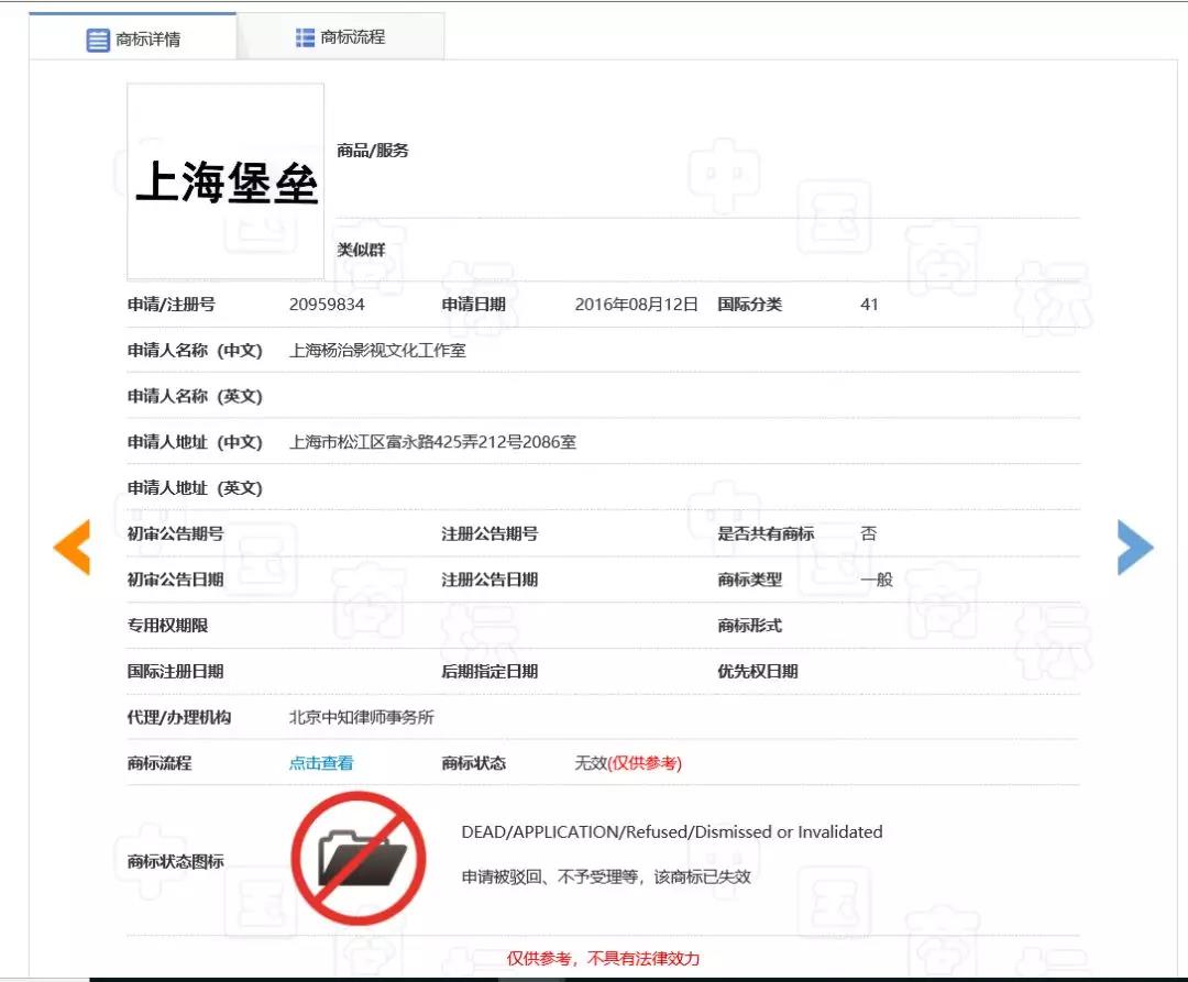 点开详情,显示目前并无一件注册成功,而且最早申请的商标可以看到申请流程,出现驳回,后经复审也未通过。