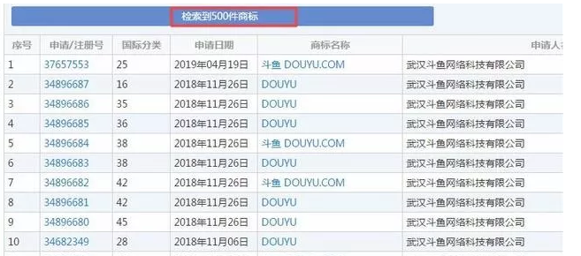 查询中国商标网得知:到目前为止斗鱼共申请注册500件商标,包括“斗鱼”、“斗鱼 DOUYU.COM”、“DOUYU”、“鲨鱼街”、“逗鱼时刻”、“斗鱼城”、“鱼翅”“斗鱼 TV”及鲨鱼图形商标。