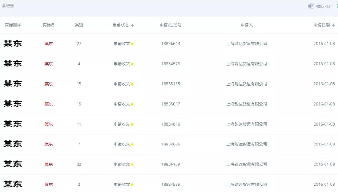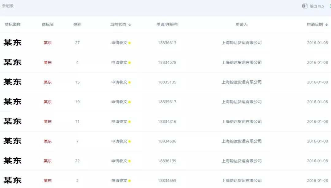 2016年1月份,韵达申请了44件“某东”商标,并且通过了初审了。