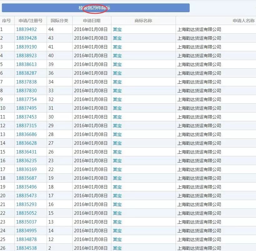 更有意思的是,京东还指出,韵达不仅注册了“某东”商标,还申请了29件“某宝”商标。