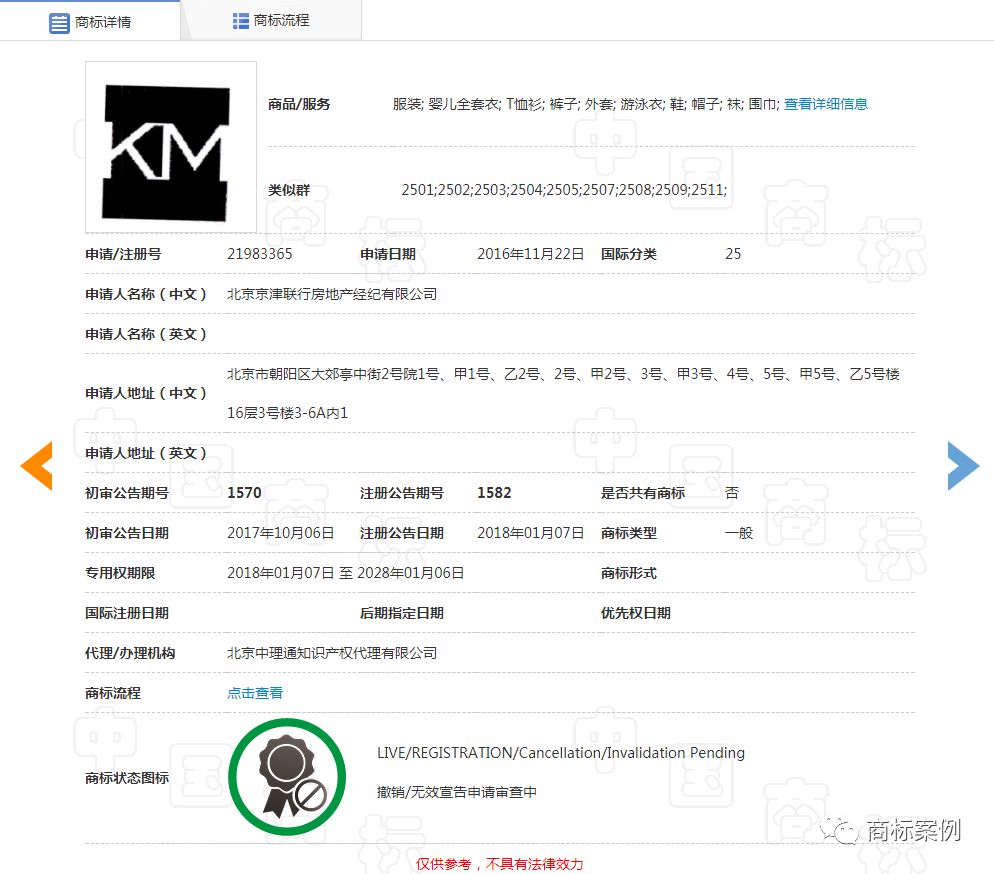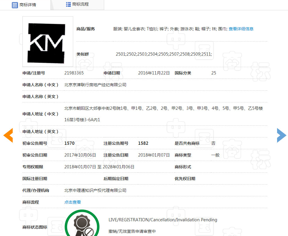 刘先生提出无效宣告请求后,第21983365号“KM”商标经商标局核准,于2018年9月6日转让给北京京津联行房地产经纪有限公司。不过,对本案而言,这家受让商标的公司是做什么的,没有什么关系。