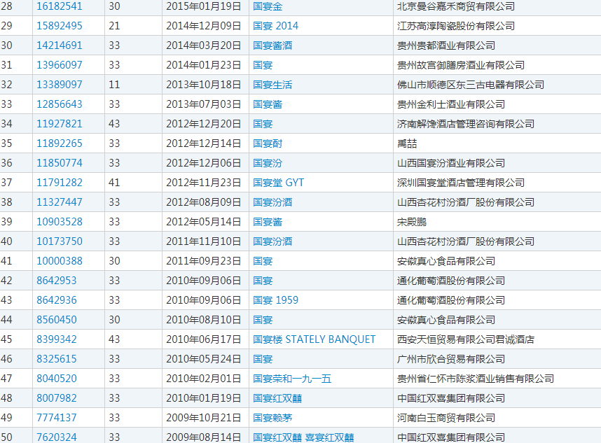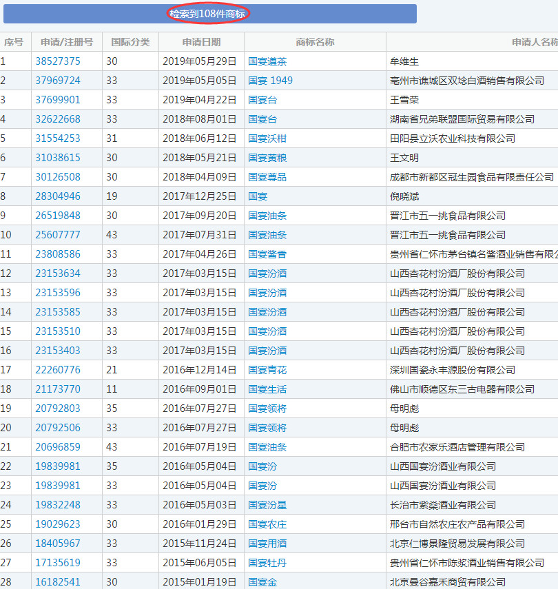 据了解,在中国商标网上,带有“国宴”的申请注册商标有108个,绝大部分为酒类产品。