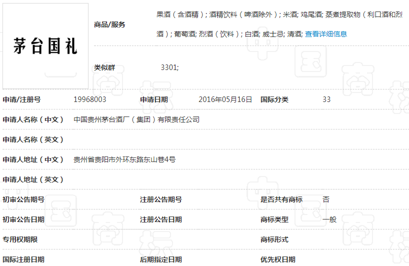2016年,在申请“茅台国宴”的同时,茅台集团还提交了“茅台国礼”、“茅台国韵”两份商标申请,均被驳回。