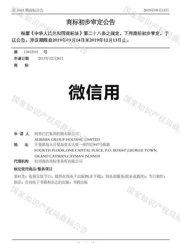 近日,国家知识产权局商标局作出第1663期商标公告,初步审定阿里巴巴集团控股有限公司申请的第13812101号商标“微信用”核准注册。该商标被核定使用在第41类电视文娱节目、出版等服务上。