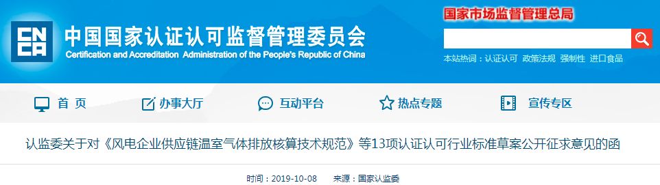 根据《认证认可行业标准制(修)订工作程序》(国认科〔2018〕15号)相关要求,各认证认可行业标准(以下简称认标)制订单位已完成了《风电企业供应链温室气体排放核算技术规范》等13项认标草案的编写工作。为保证标准的适用性及科学性,现对这13项认标草案公开征求意见。各认标草案联系人名单见附件1,各认标草案征求意见材料见附件2-14。