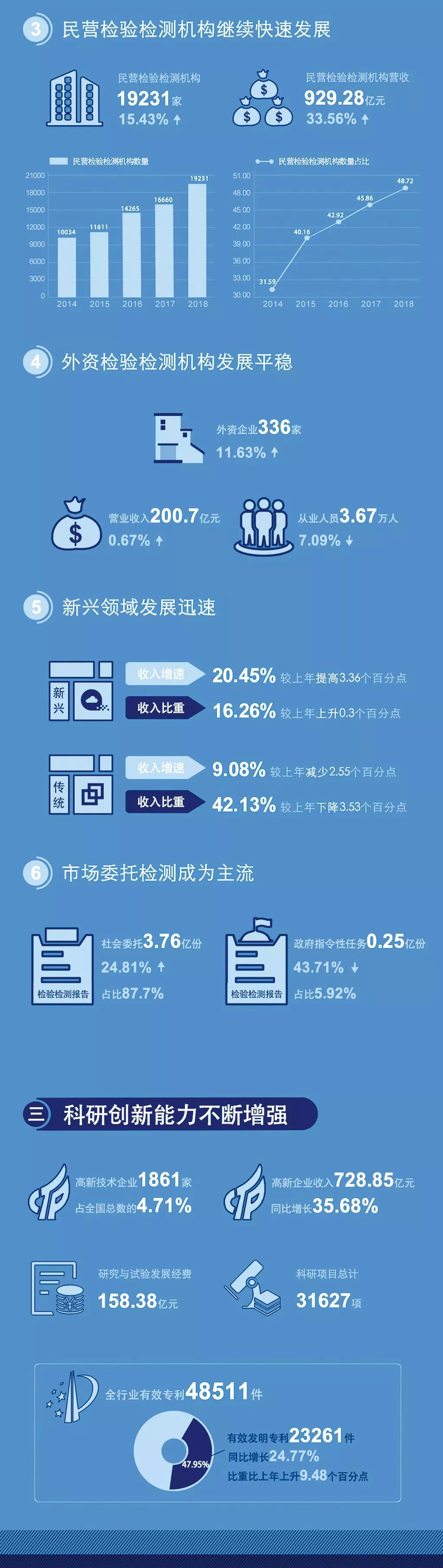 市场监管总局于2019年3月在全国范围内组织开展了2018年度检验检测服务业统计工作。统计结果表明,我国检验检测产业规模不断扩大、产业结构持续优化、科研创新能力不断增强,检验检测行业整体发展形势良好。