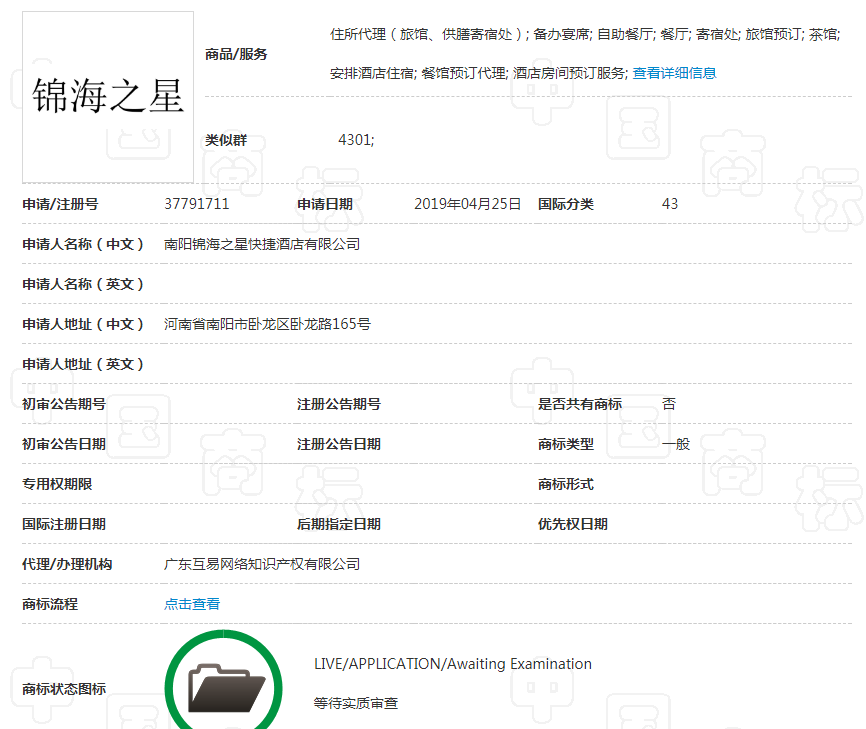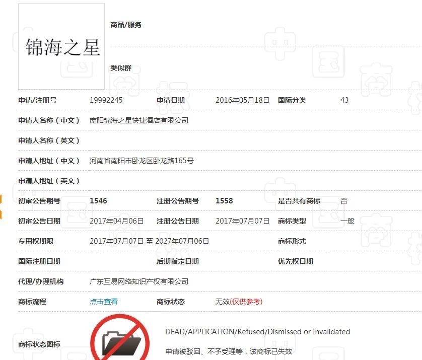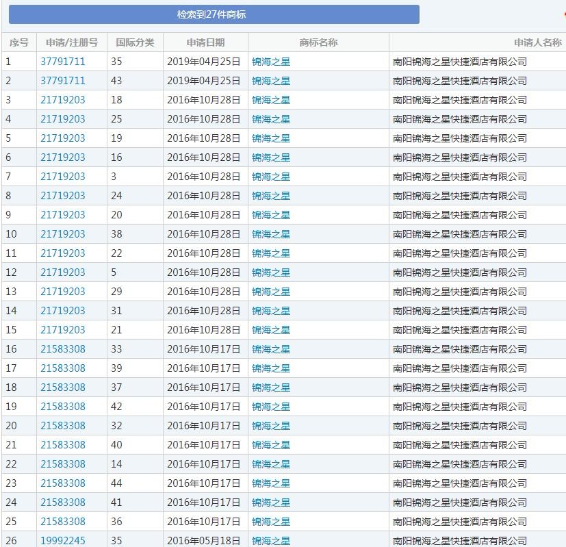 值得一提的是,“锦海之星”四个字被申请了27件商标,其中包括两件第43类商标。(第43类是酒店行业的核心商标)