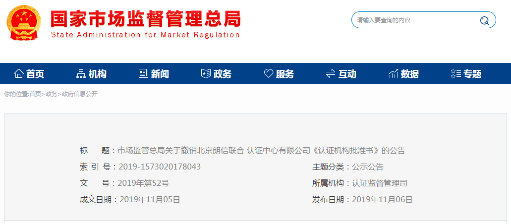 今天,国家市场监管总局官网发布公告,经现场检查,北京朗信联合认证中心有限公司已不能持续符合认证机构资质审批法定条件和能力,市场监管总局决定撤销其《认证机构批准书》。详情如下: