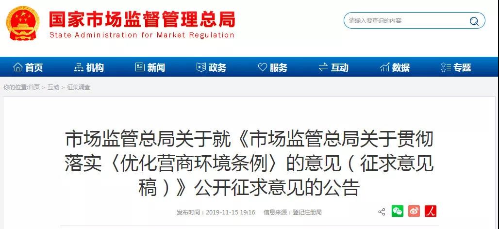 10月22日,李克强总理签署国务院令,公布《优化营商环境条例》(以下简称《条例》),自2020年1月1日起施行。为切实做好《条例》贯彻落实工作,推进市场化法治化国际化营商环境建设,市场监管总局起草了《关于贯彻落实〈优化营商环境条例〉的意见(征求意见稿)》,现向社会公开征求意见。征求意见的截止日期为2019年11月22日。