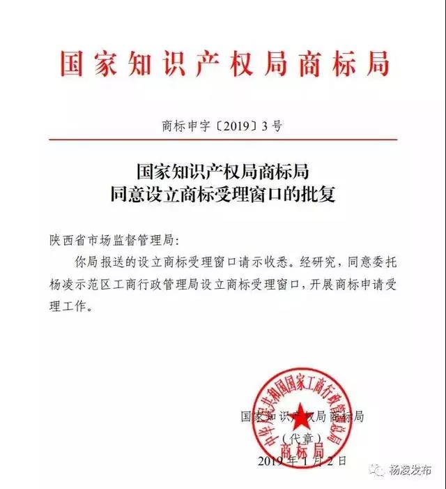 1月2日,国家知识产权局商标局正式批复,同意委托杨凌示范区工商局设立商标受理窗口,开展商标申请受理工作。这是杨凌示范区工商局在示范区党工委、管委会和省市场监督管理局的领导下