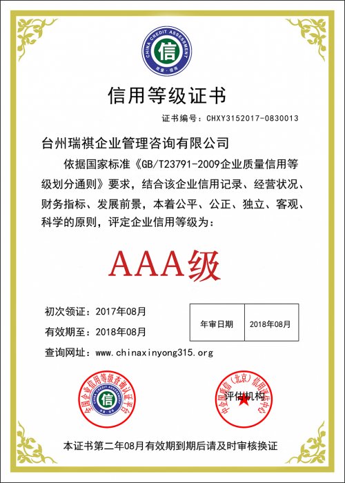 台州瑞祺荣获中国中小企业信用AAA级荣誉证书热烈祝贺台州瑞祺获得中国中小企业信用等AAA级荣誉证书。此次能够获得中国中小企业信用AAA级荣誉证书,一方面是对台州瑞祺诚信经营口碑与创新