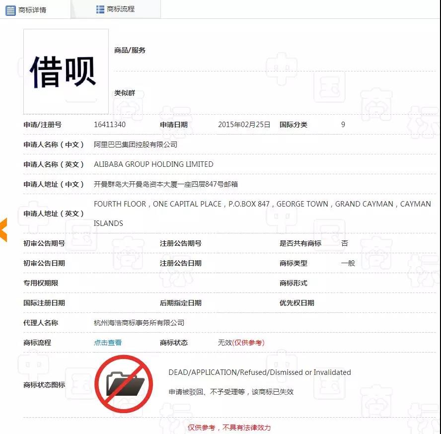 支付宝旗下有借呗和花呗,但是不同的是,花呗注册成了商标,而借呗这个商标就没有那么幸运了。阿里巴巴在2015年2月25日一共申请提交了5个借呗商标,注册类别分别为第9类、第35类、第36类